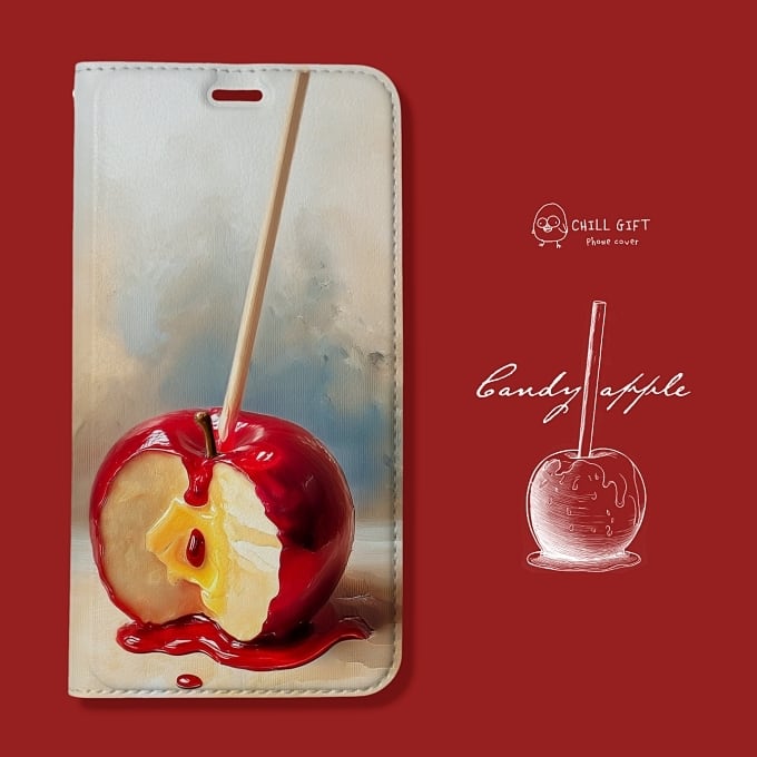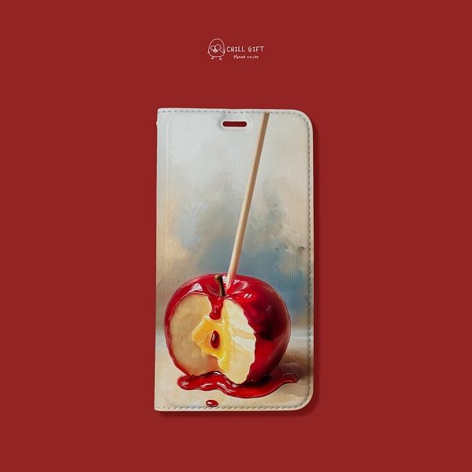 お祭りの屋台で定番のりんご飴をモチーフに、絵画で表現した手帳型カバーです。