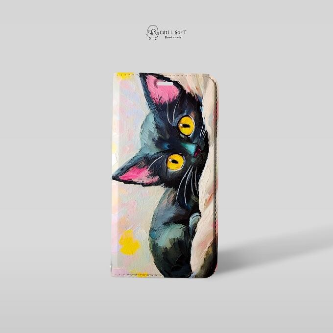 手のひらの中の絵画展~黄色いおめめの黒猫さん~ 選べる帯なしor帯あり 手帳型スマホケース iPhone Android 多機種対応