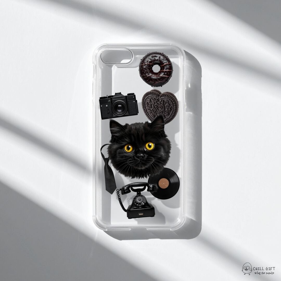 黒猫を中心に、カメラやレコード、クリームサンドクッキーなど“黒”の世界観を散りばめたシックなデザイン。レトロ感とミステリアスな雰囲気が魅力の、大人かわいいケースに仕上げました。