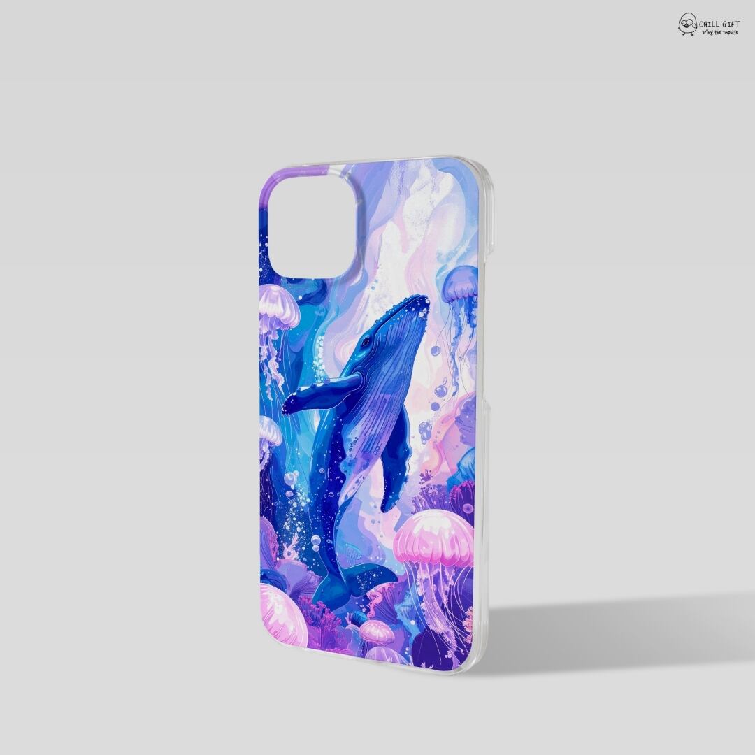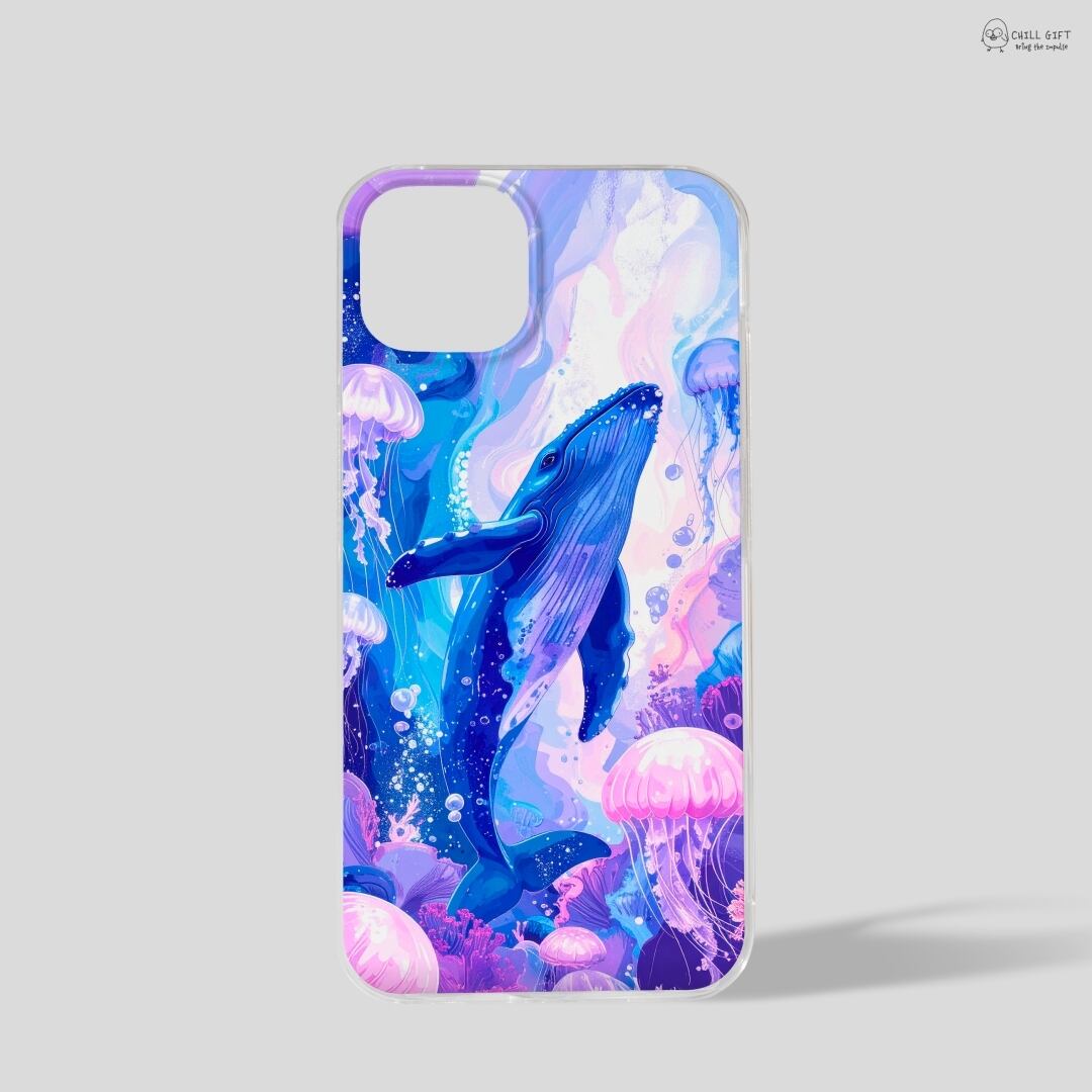 青とピンクが溶け合う幻想的な海の世界を描いたクリアスマホケース。